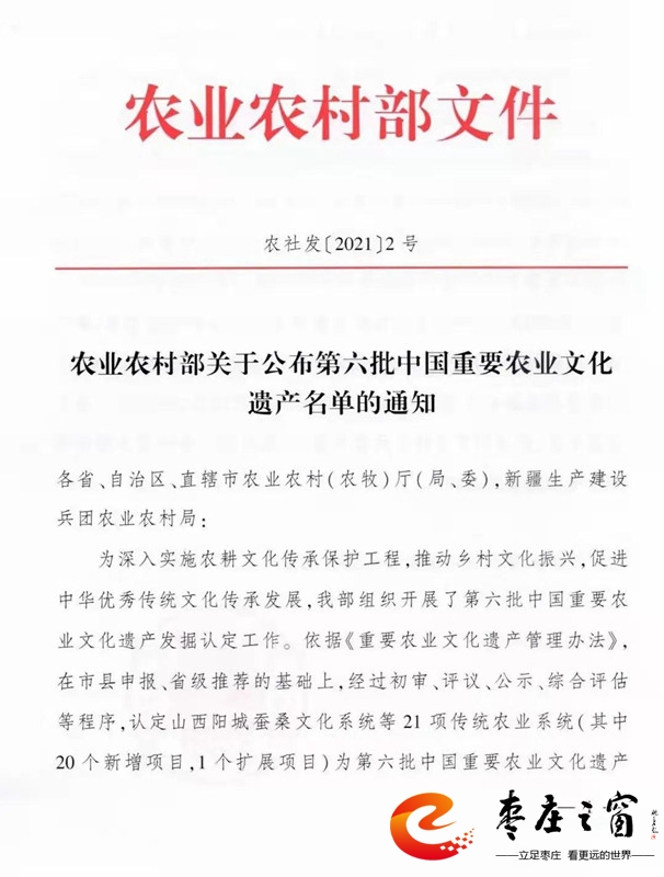 11月16日,農(nóng)業(yè)農(nóng)村部公布第六批中國重要農(nóng)業(yè)文化遺產(chǎn)名單,認(rèn)定山西陽城蠶桑文化系統(tǒng)等21項(xiàng)傳統(tǒng)農(nóng)業(yè)系統(tǒng)為第六批中國重要農(nóng)業(yè)文化遺產(chǎn),其中嶧城石榴種植系統(tǒng)入選。