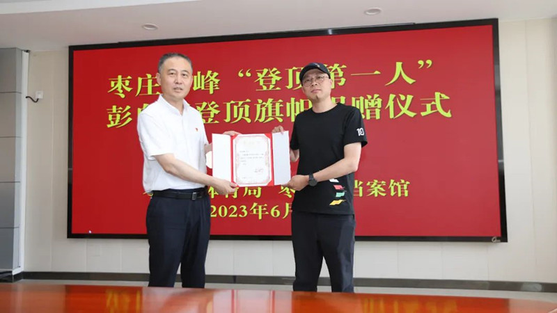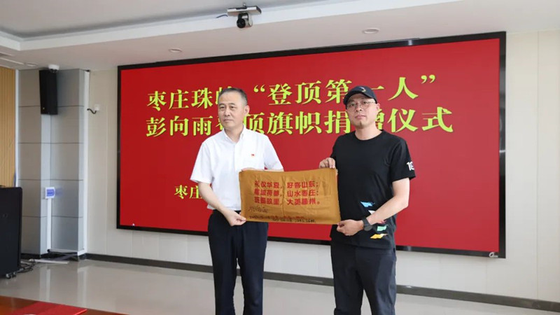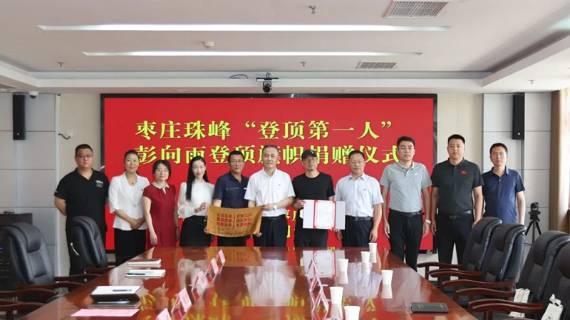 棗莊珠峰“登頂?shù)谝蝗恕迸硐蛴晗蚴袡n案館捐贈旗幟