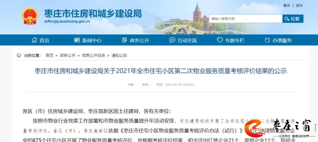 近日棗莊市住房和城鄉(xiāng)建設(shè)局發(fā)布《關(guān)于2021年全市住宅小區(qū)第二次物業(yè)服務(wù)質(zhì)量考核評(píng)價(jià)結(jié)果的公示》